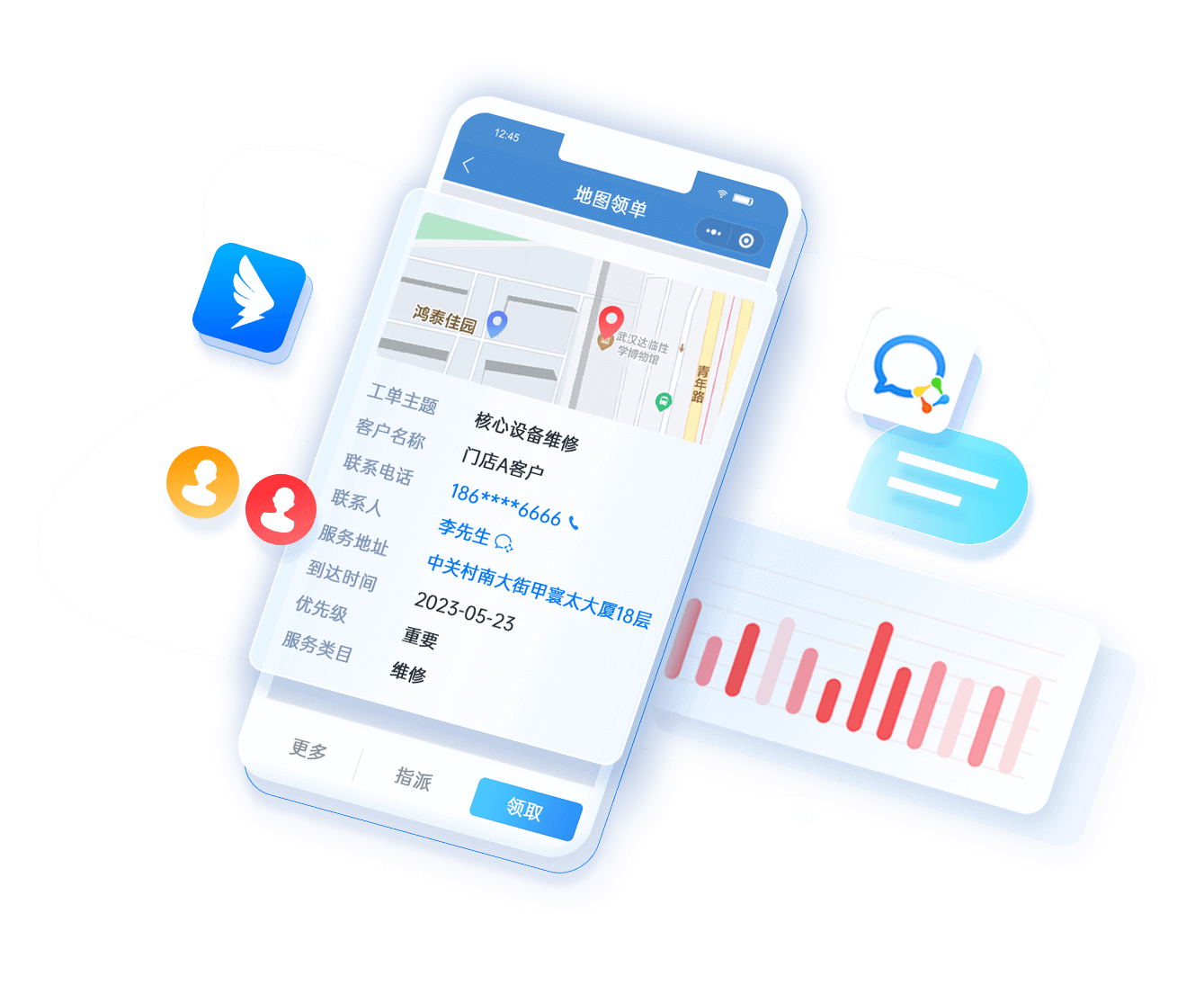 • 按區域/工單類型/產品類型進行地圖派單、手動派單和工單池搶單